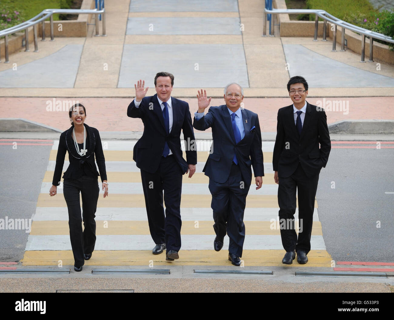 Prime Minister David Cameron Meets Students On Arrival The University Of Nottingham Malaysian Campus In Kuala Lumpur Today Where He Held A Q A With Malaysian Prime Minister Najib Razak Centre Right Stock